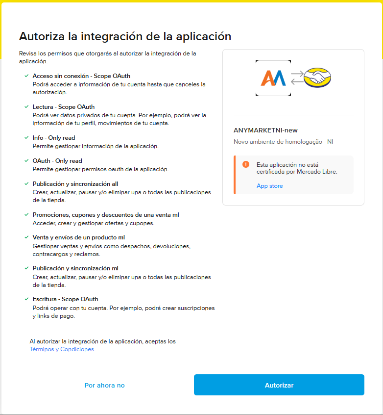 Si ya tiene una sesión iniciada en una cuenta de Mercado Libre en su navegador, esa cuenta será vinculada automáticamente al ANYMARKET.