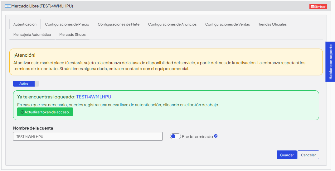 Atención: Cuando la integración esté activa, la cuenta será considerada como una nueva integración activa dentro de su plan de ANYMARKET.
