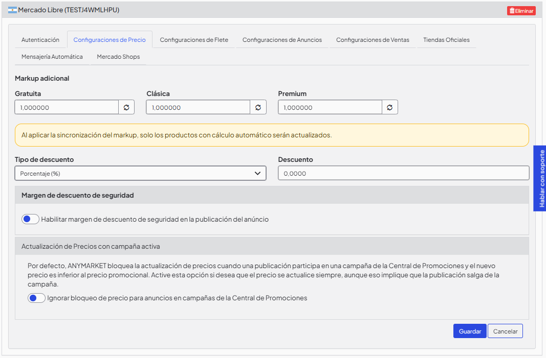 - No importar descuentos ofrecidos por el marketplace: Al activar esta opción, ANYMARKET ignorará los descuentos aplicados por Mercado Libre, importando únicamente los valores que fueron ofrecidos por el vendedor.