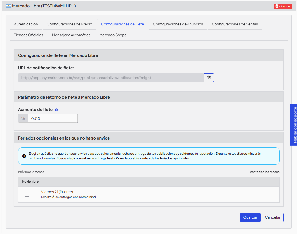 - El campo Incremento de envío (%) permite aplicar un porcentaje adicional sobre el valor del flete calculado en Mercado Libre, basado en su planilla de fletes registrada en ANYMARKET.