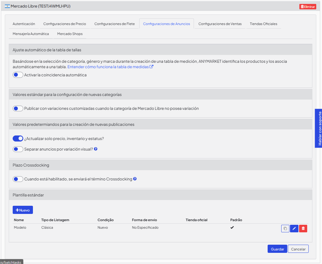 Actualizar solo precio, stock y estado: Si está habilitado, ANYMARKET solo enviará esas actualizaciones una vez que el anuncio esté activo.