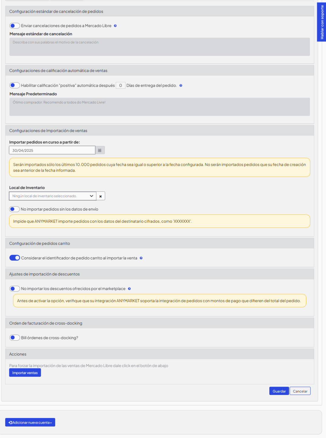 - Enviar cancelaciones a Mercado Libre: Cuando está habilitada, permite cancelar pedidos directamente desde ANYMARKET.