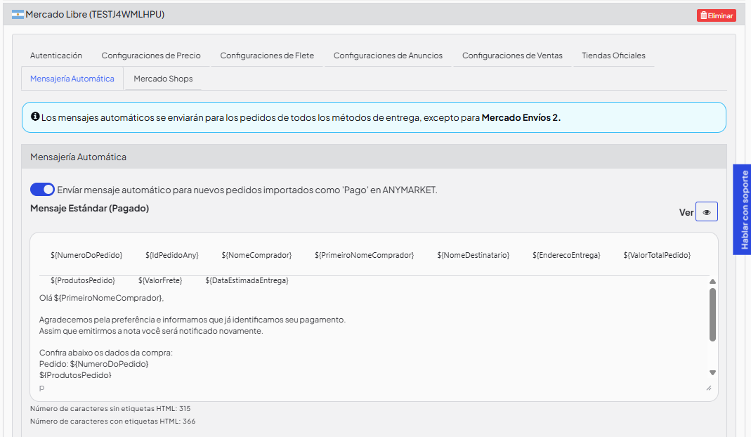 La mensajería es un recurso que le permite comunicarse con el cliente a través de un mensaje personalizado. Este mensaje será enviado de acuerdo con el cambio de cada estado del pedido. ANYMARKET pone a disposición algunas variables que pueden ser utilizadas.