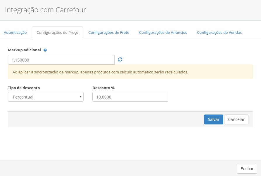 - Markup adicional: Insira o Markup que será recomendado aos novos anúncios. Por exemplo, se o preço base de seu produto é R$ 100,00 e aplica o markup de 1,20, logo o preço encaminhado será de R$ 120,00.
