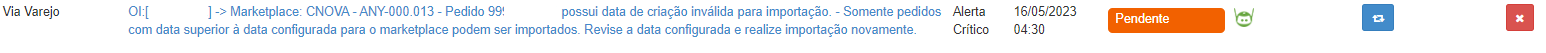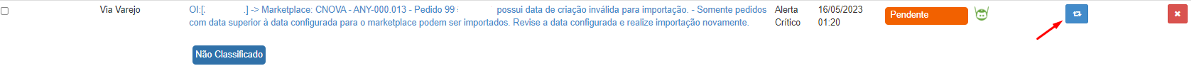 A maneira de resolver isso é ajustando a data no módulo de integração, e posteriormente, retentando o pedido, para isso, clique no ícone azul “Tentar novamente” (Painel de Monitoramento):