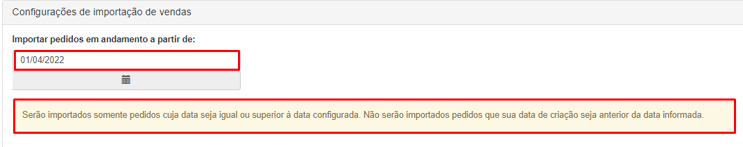 Em todos os módulos de configuração de canais de venda no ANYMARKET, há uma aba referente a configurações de vendas, onde é configurado a data inicial de importação, indicando a partir de qual data os pedidos devem ser integrados. Exemplo: