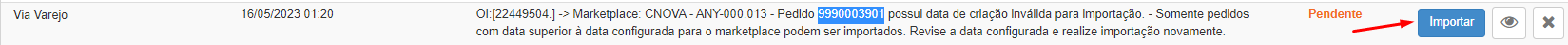 Caso tenha aparecido um alerta semelhante a esse em seu Painel de Monitoramento e/ou na aba ‘Não Importados’ presente na tela de vendas, indica que o respectivo pedido não integrou no sistema devido a configuração de vendas no módulo de integração está superior a data da venda: