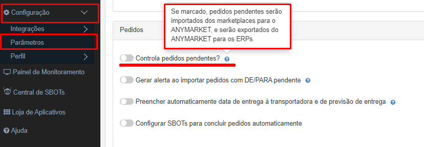 Caso tenha aparecido um alerta semelhante a esse em seu Painel de Monitoramento e/ou na aba ‘Não Importados’ presente na tela de vendas, indica que o respectivo pedido não integrou no sistema pois na sua conta ANYMARKET, a opção de importar/controlar pedidos pendentes não está habilitada.