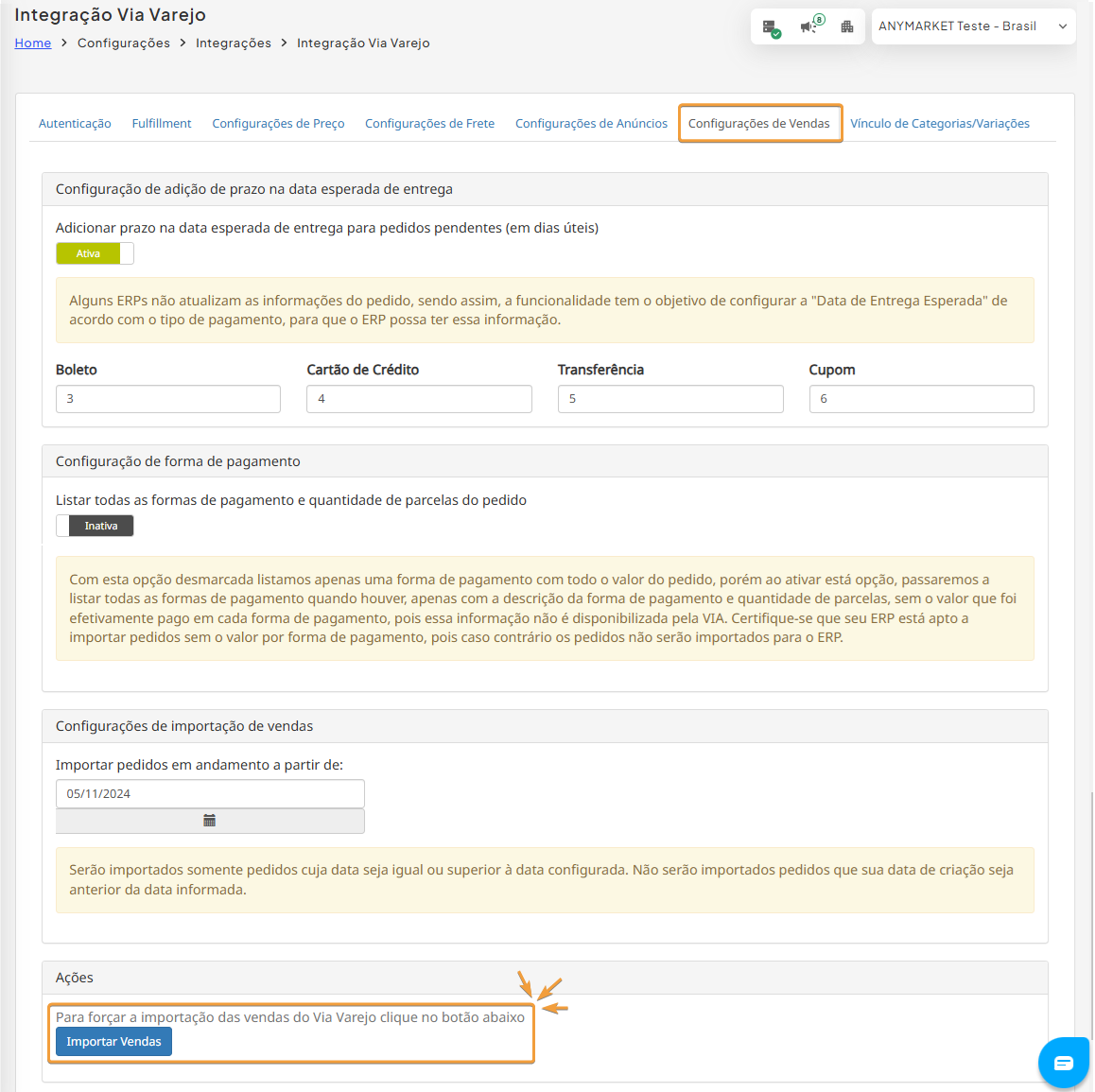 • Os pedidos fulfillment não são atualizados a partir do ANY. Apenas consultamos as informações do marketplace.