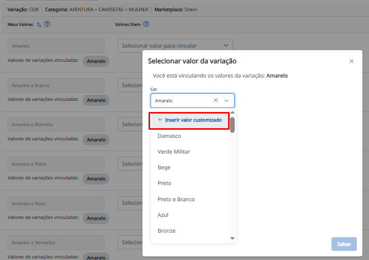 Se o valor não existir ainda, a plataforma permitirá que você o insira e associe o valor desejado.